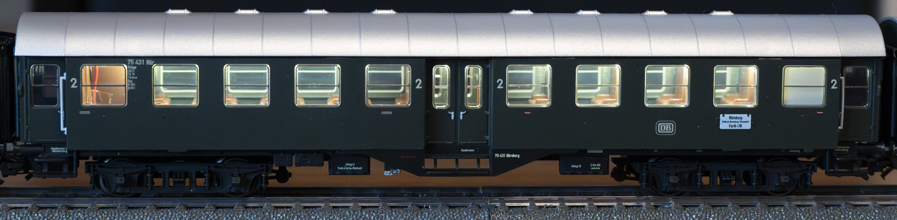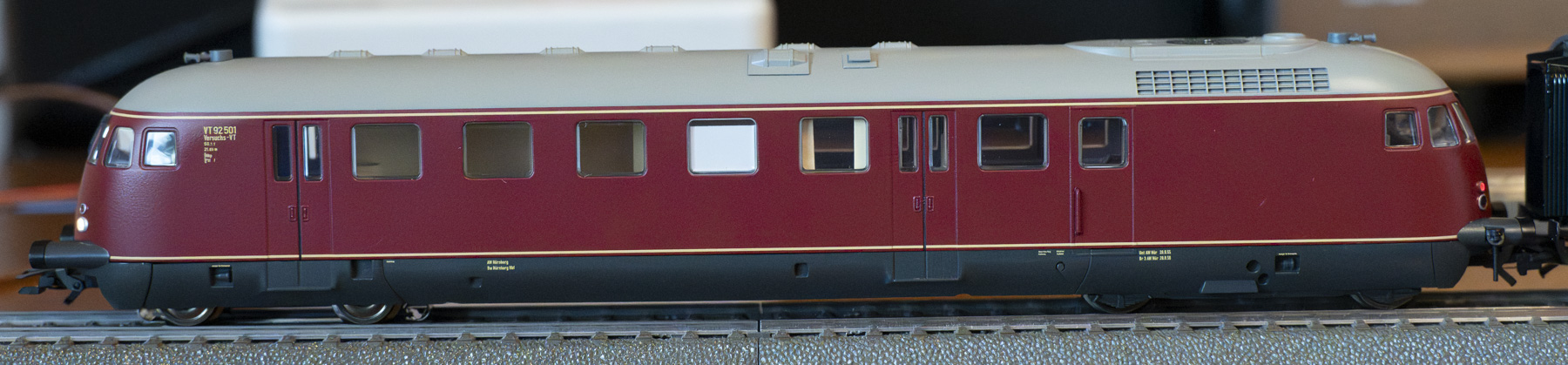 Der VT92.5 zieht auf der Modellbahn einen Personenzug. (Fotos: Attenhauser)Rote Lok, grüne Wagen – die Farbkombination war von den 1950er bis in die 60er Jahre auf Schienen eine erfolgreiche Kombination. Der Dieseltriebwagen VT 92.5 läuft auf H0-Schienen in der Märklin-Version aus dem Jahr 2021 mit einer Güter- und Personenwagen-Variante. Bis zur Ausmusterung Ende der 70er Jahre war der 92.5 noch als Schlepp-Lok in einem Ausbesserungswerk aktiv. Der Modellzug wirkt mit Wagenlichtern besonders gut.